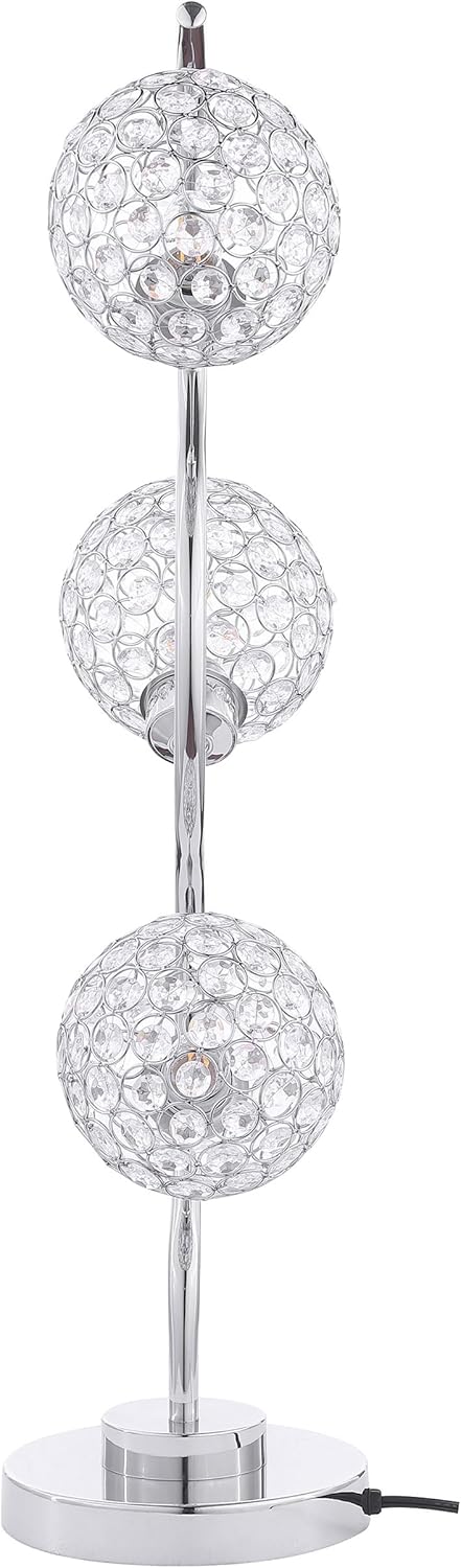 Add a bold touch to your space with this sculptural 33-inch table lamp, designed with a twisting corkscrew post and elegant curvy frame. Three orb shades accented by crystal-like embellishments diffuse light beautifully across modern living spaces. A sleek chrome metal finish and smart touch-switch operation offer both style and function. This energy efficient table lamp is perfect for nightstands and side tables or as a statement in your living area or bedroom.